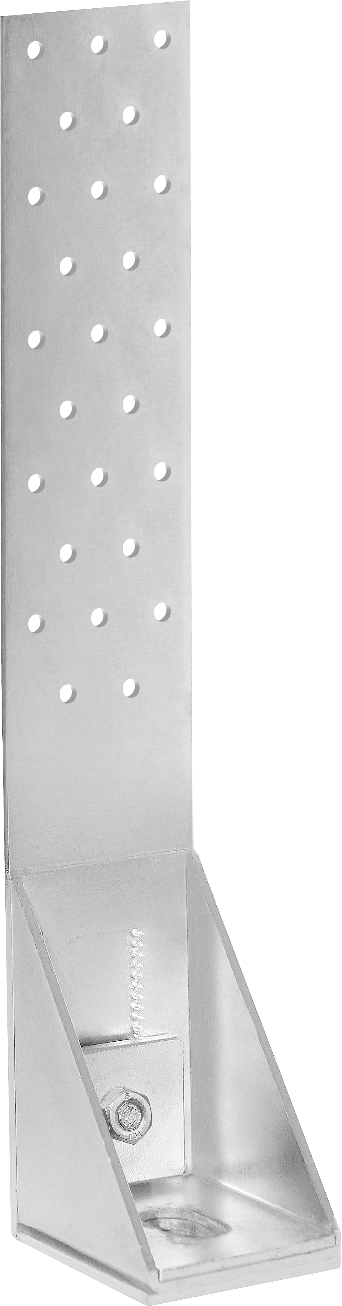 Auf der Baustelle wird der Fußwinkel bündig auf der Bodenplatte montiert. Unebenheiten in der Bodenplatte bis zu 30 mm werden über die Verzahnung schnell und einfach justiert und mit einer Mutter M10 fixiert.